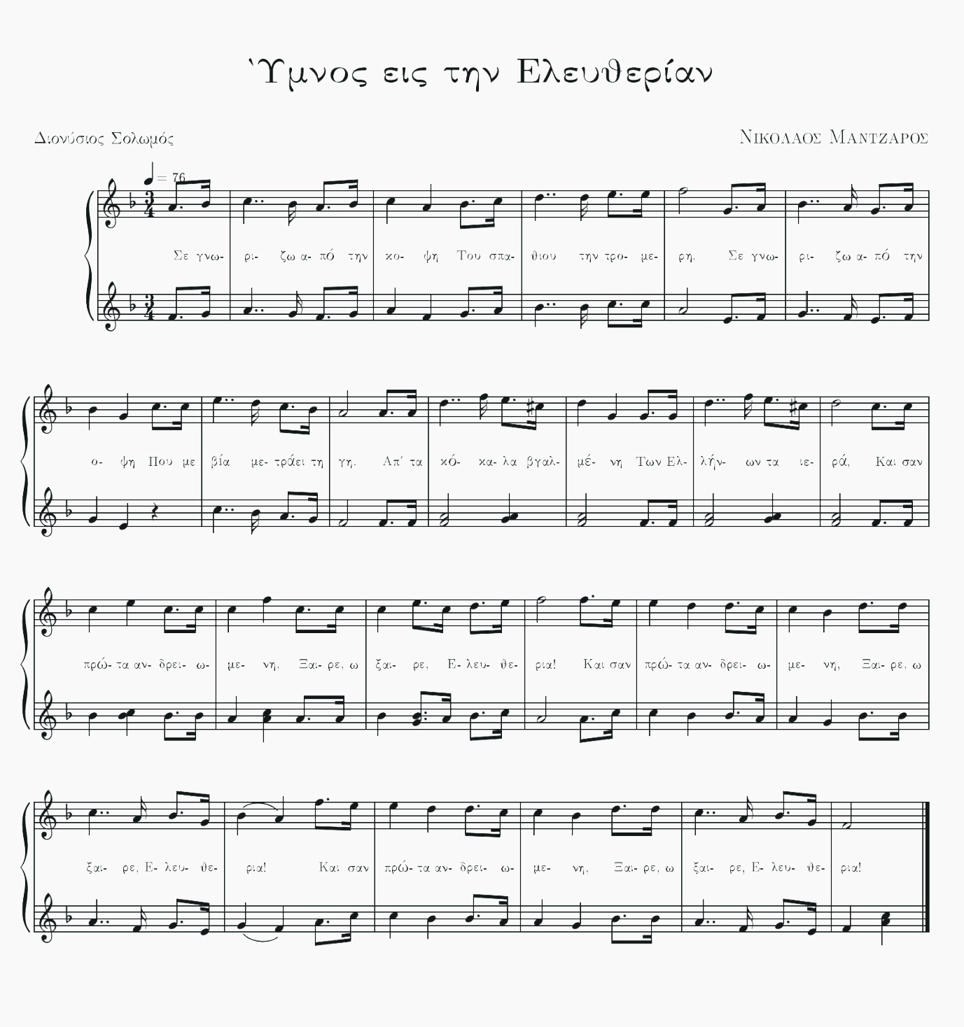 出かける前にギリシア国歌の練習をしていたのは、できればパルテノン神殿の前でギリシア国歌をフルートで演奏できればとの単純な思いであった。しかし私の演奏に想像をはるかに超えるギリシアの人々の反応であった。まさか私の拙い演奏にここまで感動してもらえるとは思いもよらず、国歌という事でうけたとしか思えなかった。もし外国からの旅行者が「君が代」を演奏しても、これほどまで日本人を感動させられるか疑問である。日本に帰ってきて改めてあのギリシアの人々の感動を思い出し「ギリシア人にとってギリシア国歌は何か特別な曲ではないか」と考えるに至った。そして曲の特徴であるリズムとメロディーと歌詞を読み返し、アメリカ合衆国の「星条旗」、フランスの「マルセイエーズ」、イギリスの「God save the King」、イタリアの「マメーリ賛歌」、ロシアの「ロシア連邦国歌」を比べてみた。これらはオリンピックやサッカーのワールドカップで耳慣れている曲である。日本とイギリスの国歌は愛する人や君主を讃える歌で静かに聞く歌である。フランス、イタリアの国歌は民衆の苦難の歴史から国民の団結を高らかに歌っている。アメリカの国歌はまさに軍隊の行進曲にピッタリの歌である。一方ロシアの国歌はクラシックの趣を感じさせる素晴らしい曲で、ロシア人の音楽性の高さに感心するとともに、無下に戦争の中にあるロシアの人々の自由と幸せを願わずにはいられない(是非一度聞いて頂きたい)。そしてギリシア国歌はこれらの国歌とは一線を画している。先に述べた様に「自由への賛歌」という題が示すように、今我々が享受している自由というものは我々の先祖ヘレネ人の血と骨で築き上げられたものであると、さすがにギリシア哲学を生んだ民族の誇りを高らかに歌い上げている。きっと私のフルート演奏を聴きながら、心の中でこの歌詞を歌っていたと思われる。なるほどギリシア国民としての誇りと自分自身の誇りが一体になる、ばらし歌詞とメロディーでギリシアの人々の魂の奥に響く国歌であること納得した。人を束ねて集団行動を煽る行進曲には向かない曲である。最後にギリシア国歌の楽譜を紹介して口笛ででも歌って頂ければ幸いである。